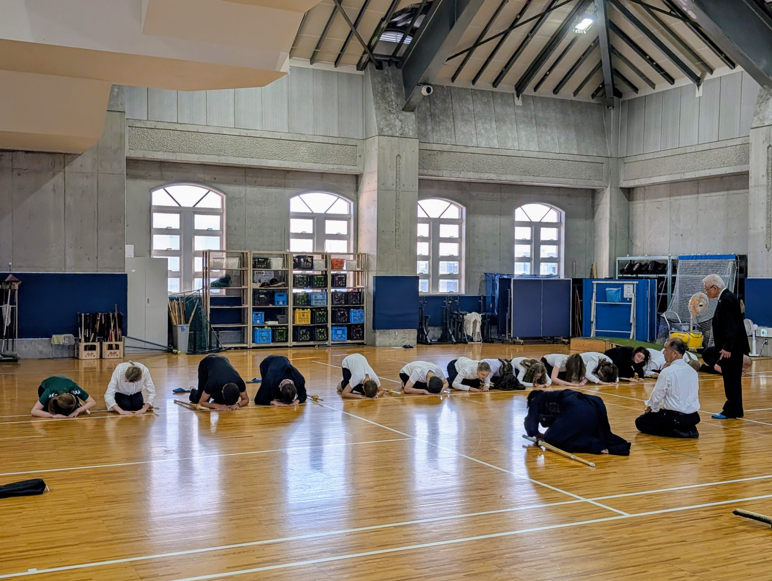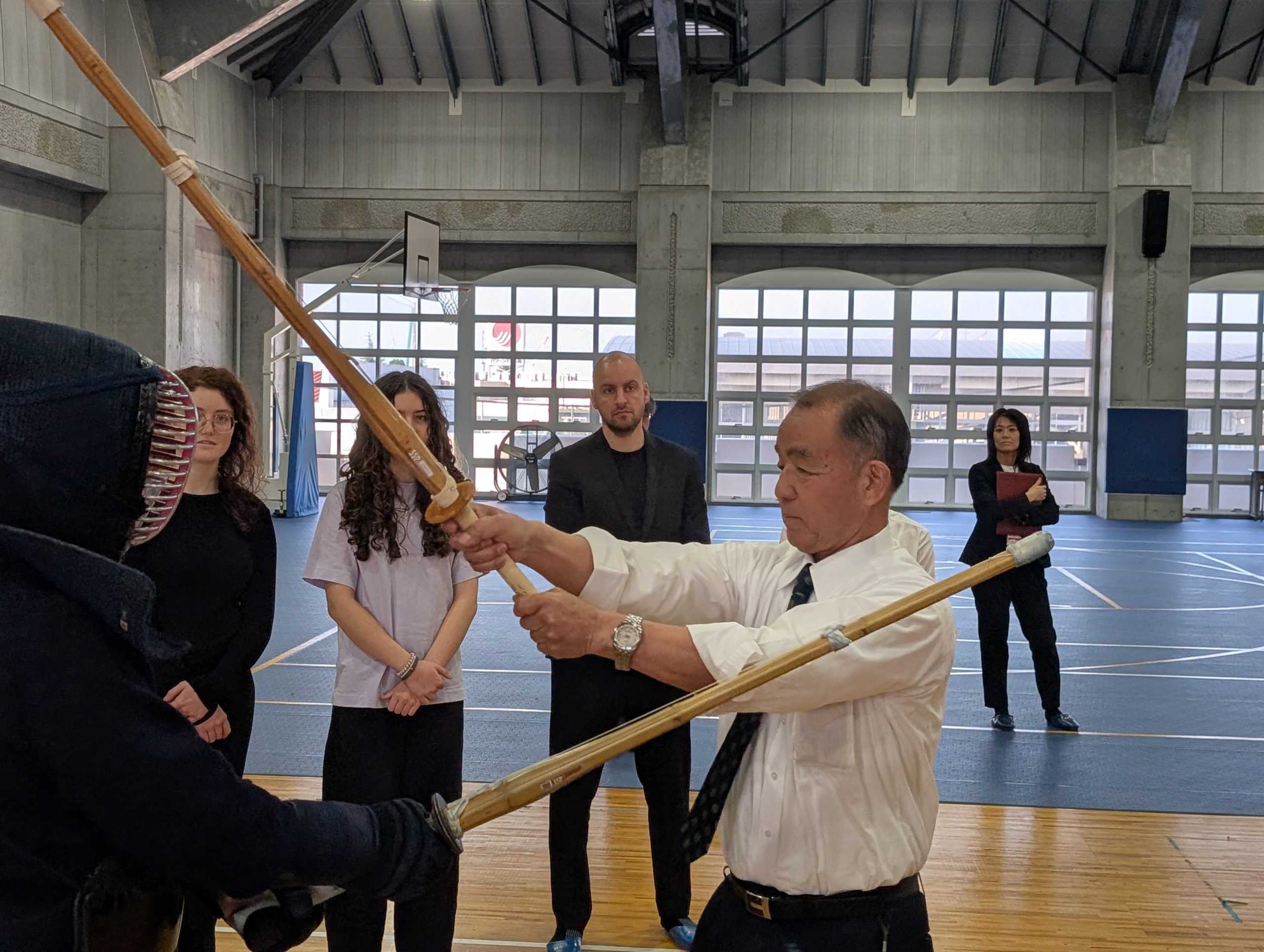 続いて、少林寺拳法・なぎなた・剣道など、各クラブの演武を見学し、藤井学園の今西理事長による剣道の体験指導も行われ、ドイツの生徒・先生方、そしてパクシュ市長にもご参加いただき、大いに盛り上がりました。