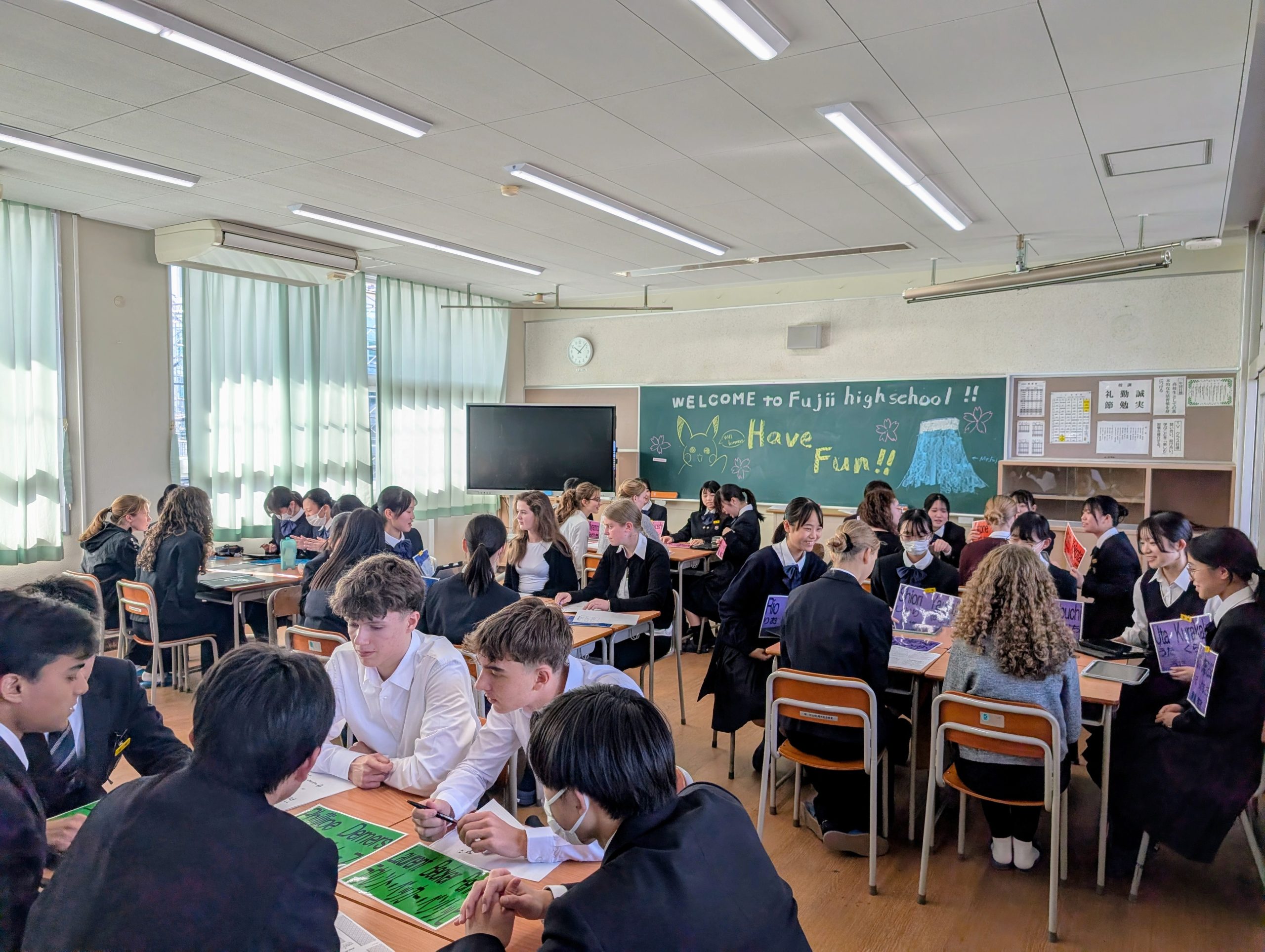 来校した生徒の皆さんは、本校の魅力にたくさん触れ、たいへん喜んで若い世代同士が笑顔と温かな雰囲気の中で交流する、両国の生徒にとって意義深い一日となりました。なお、ご一行は1週間の滞在を予定しています。