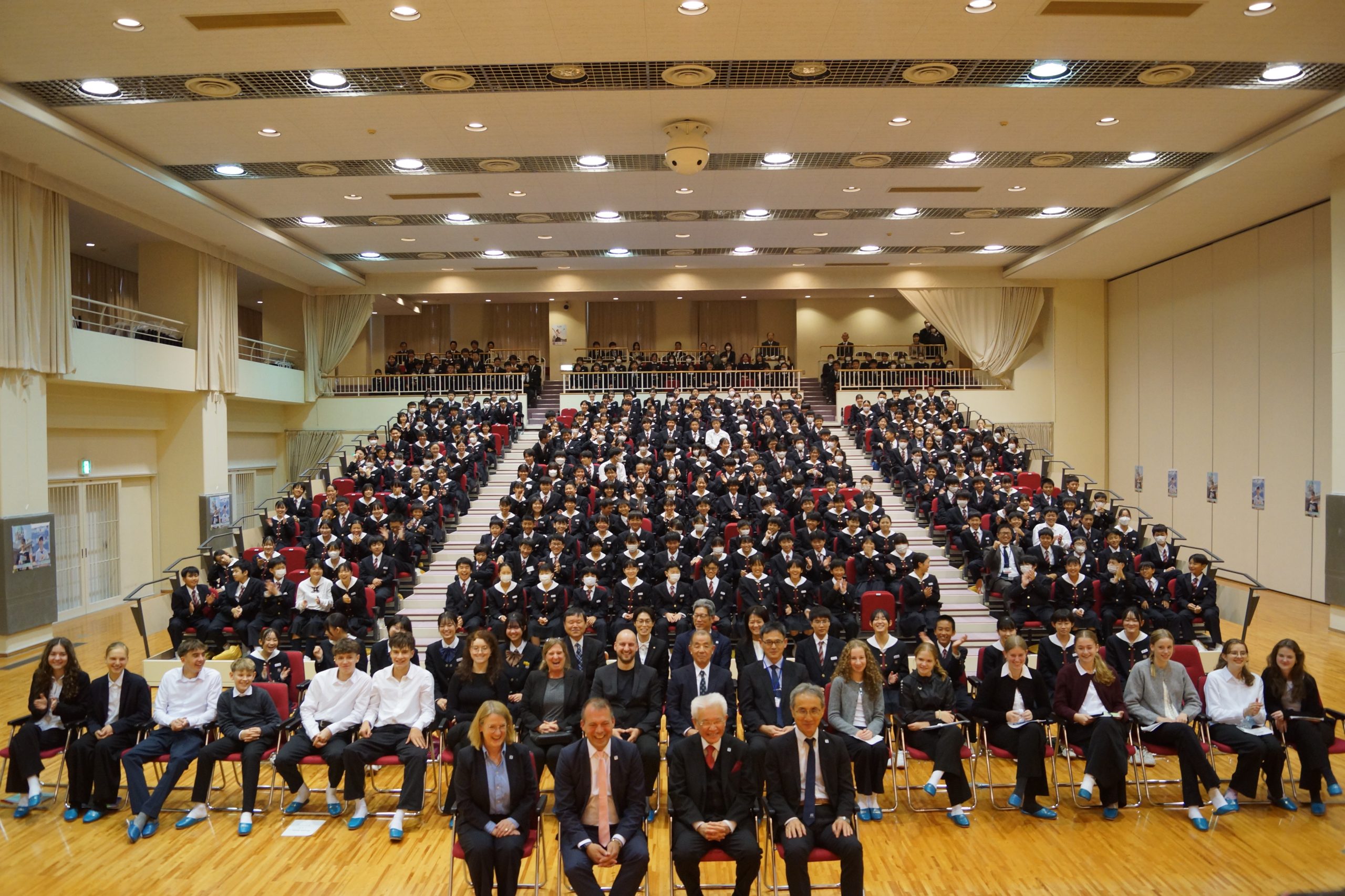As part of the Japan–Germany exchange between St. Bernhard-Gymnasium in Willich (Germany) and Fujii Gakuen, 14 German school students arrived in Marugame on November 8th, accompanied by two teachers. Today was the first day of the exchange program. They were welcomed at a reception ceremony. They were introduced to the music club, which featured the traditional instrument psaltery, and enjoyed a performance by the dance club.