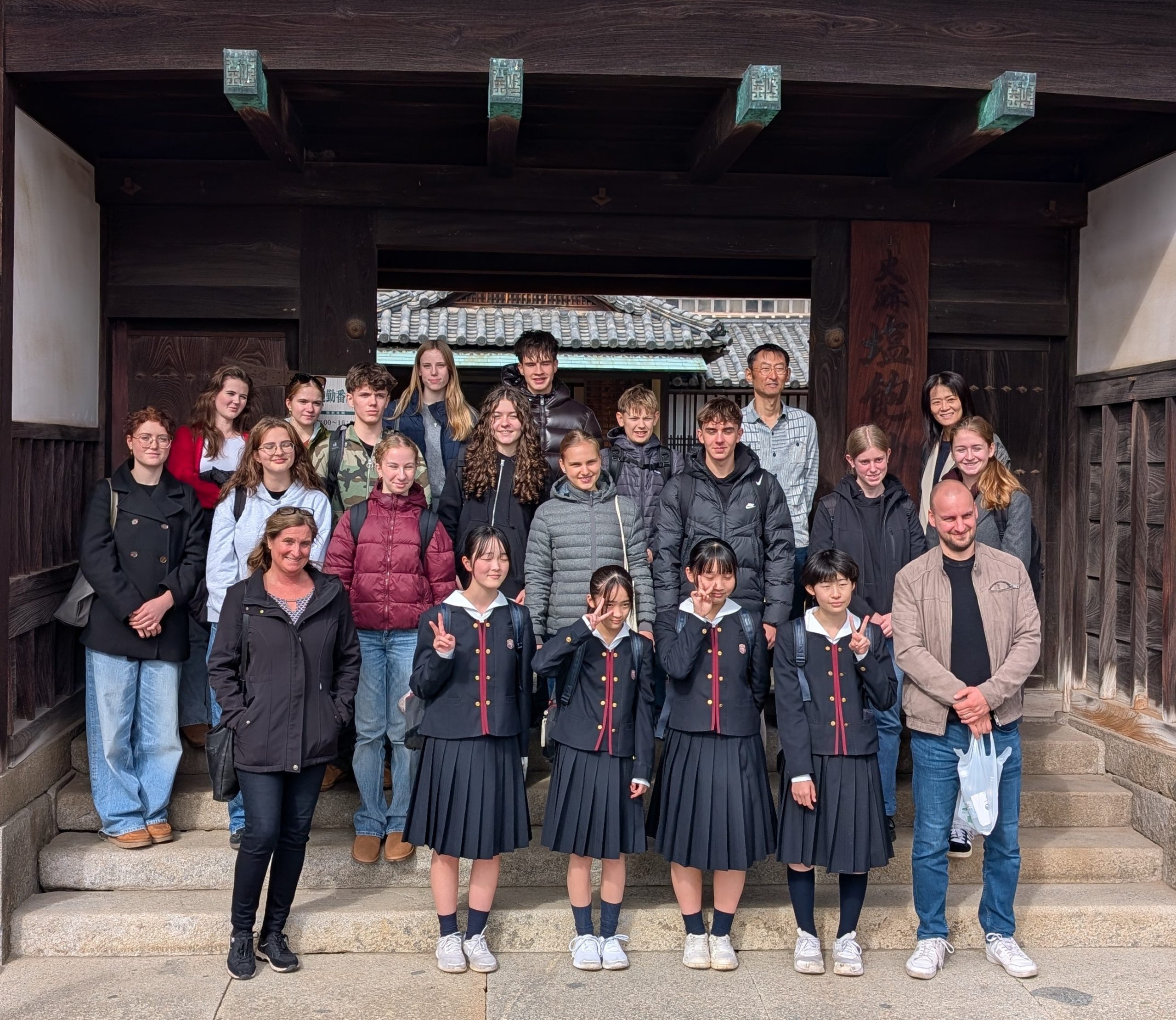 This morning, we attended a tea ceremony at Fujii Gakuen, hosted by the Tea Ceremony Club. The German school students discovered a whole new world and thoroughly enjoyed what they saw and tasted. Around 10:00 a.m., we headed to Marugame Port and took a boat to Honjima Island.  After arriving there, We had a bento lunch at a restaurant, then walked to the Kasashima Important Preservation District for Groups of Traditional Buildings.