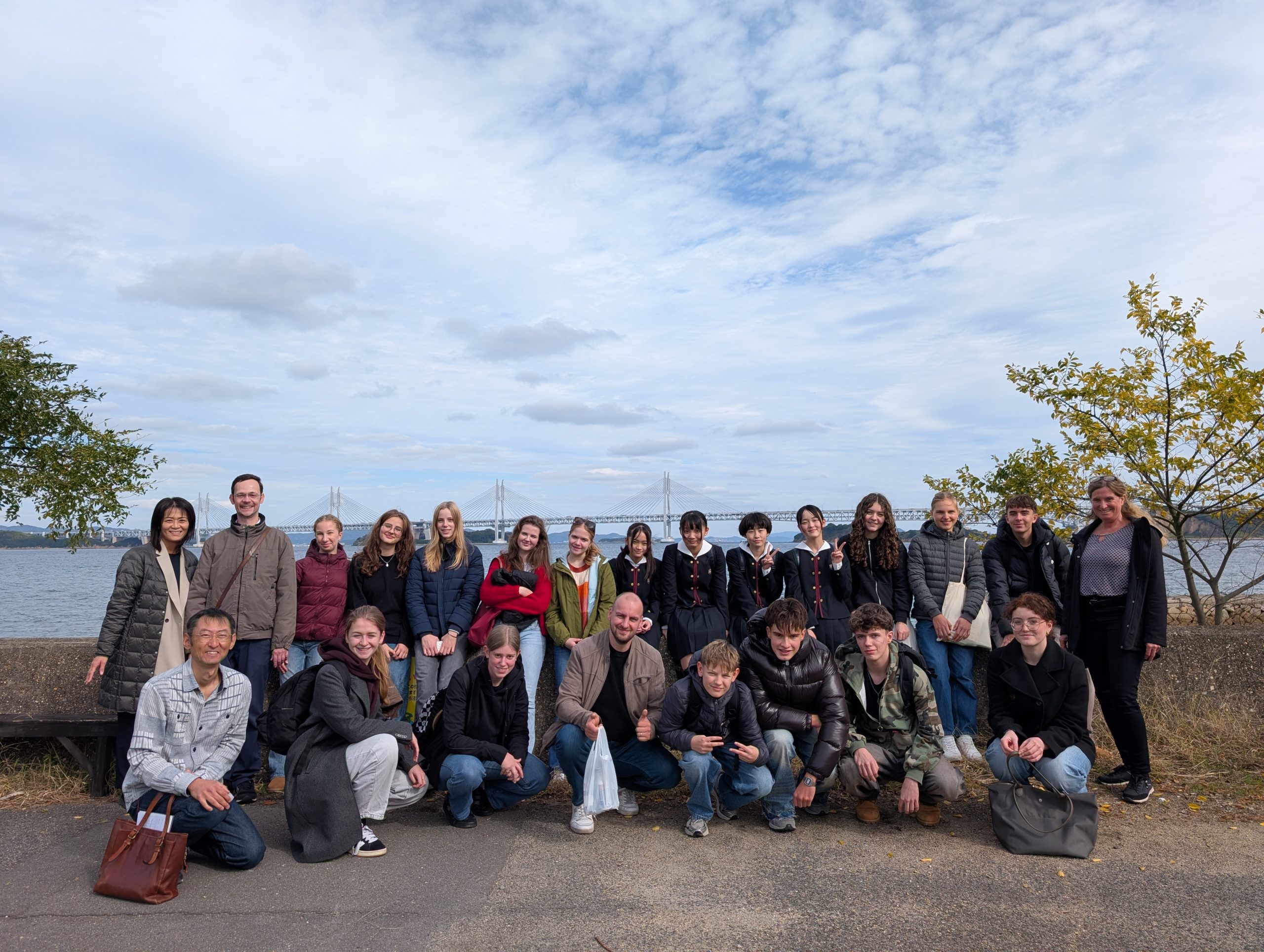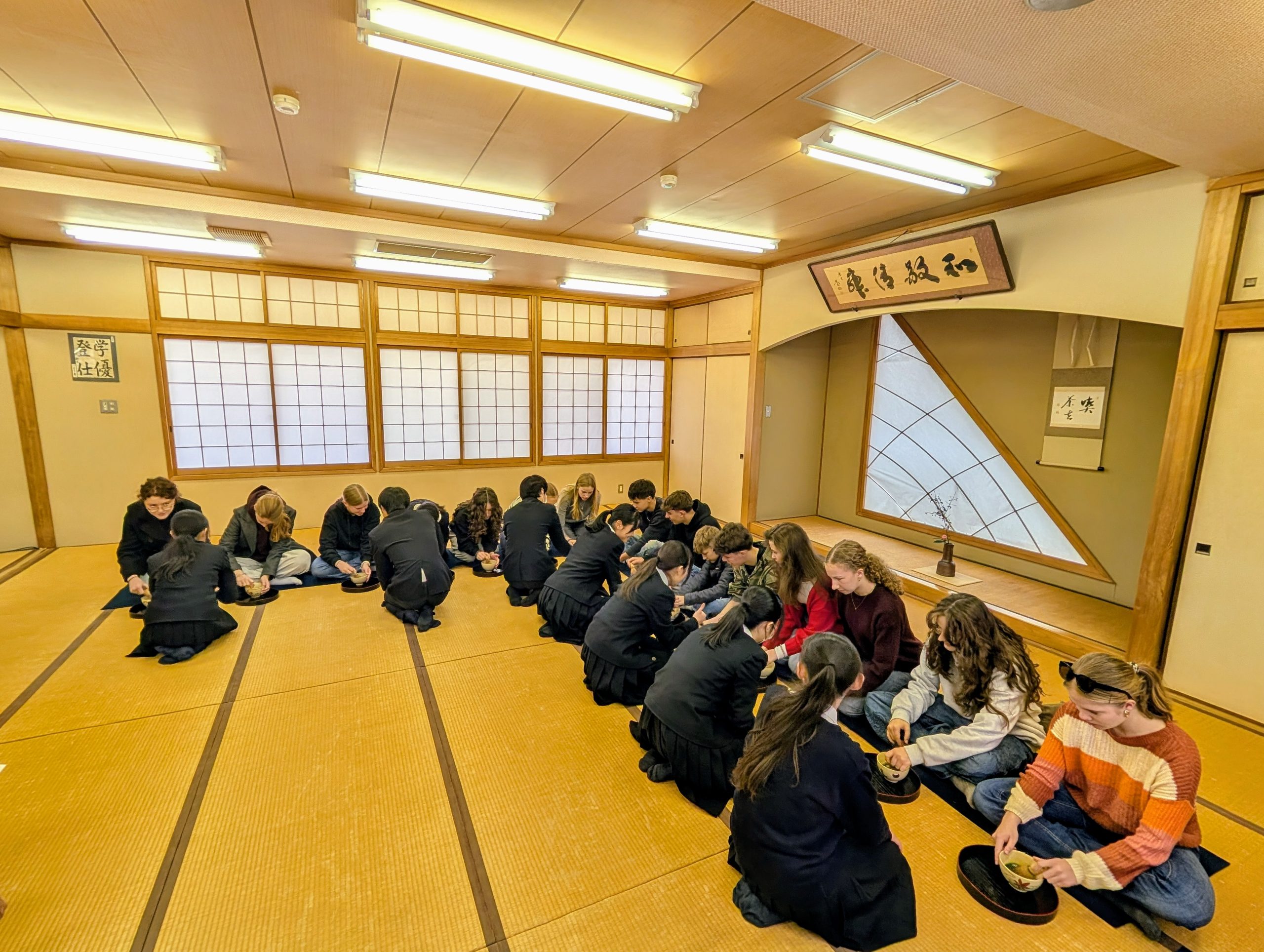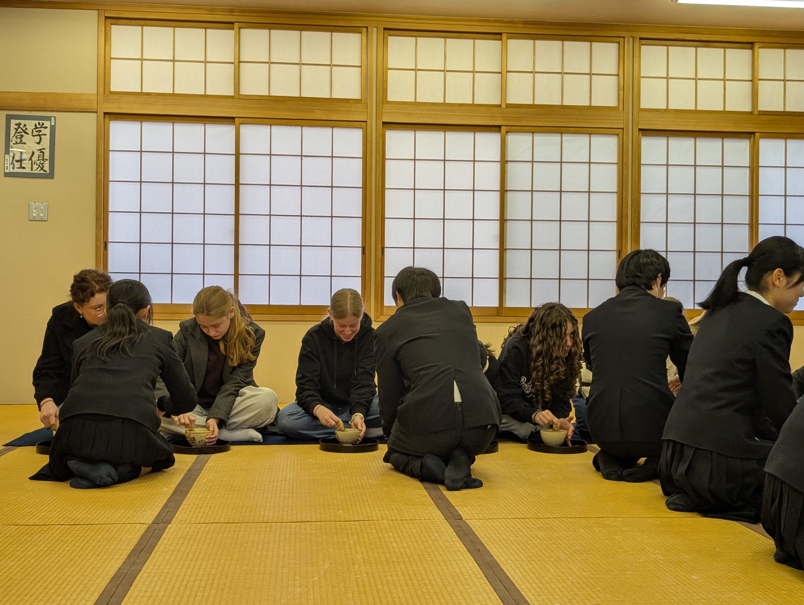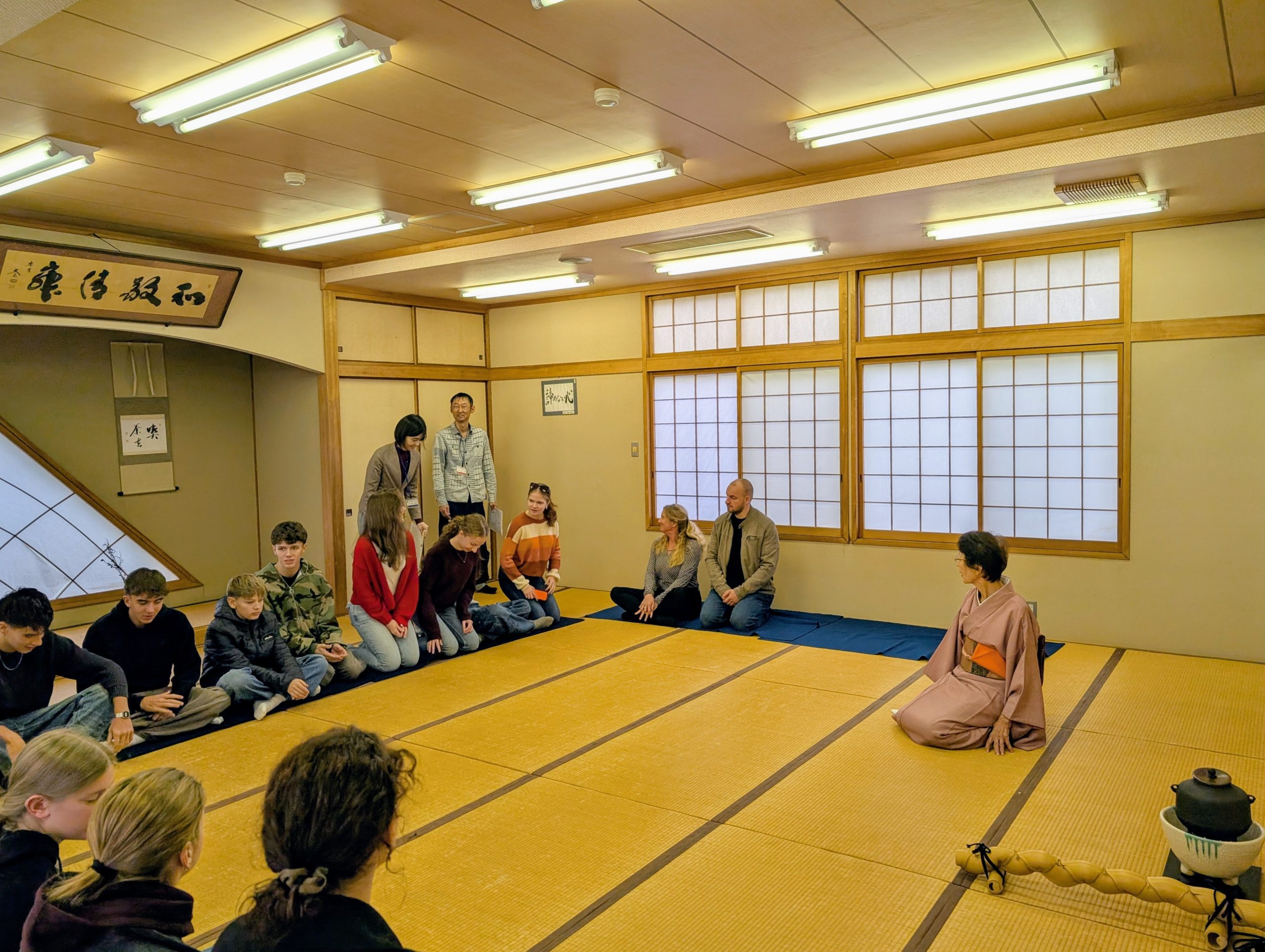今朝、藤井学園で茶道部主催の茶会に参加しました。ドイツの生徒たちは全く新しい世界に触れ、見たり味わったりしたものを大変楽しみました。