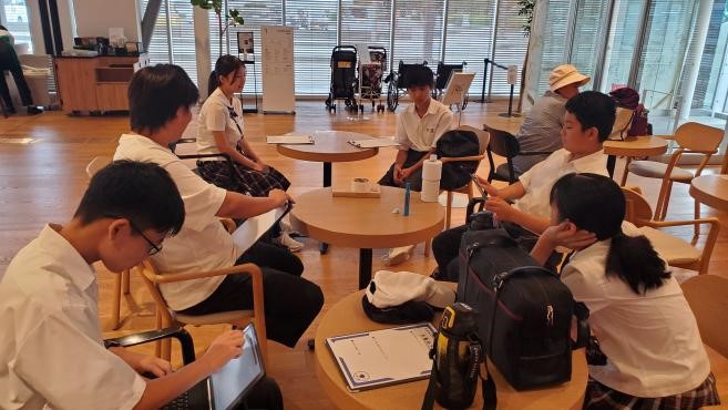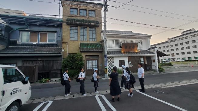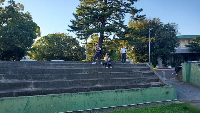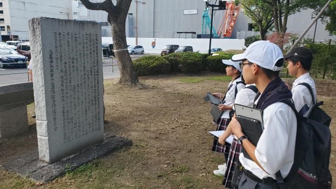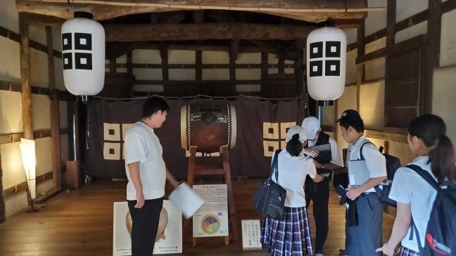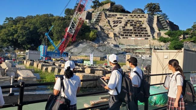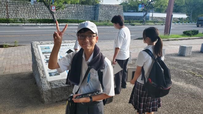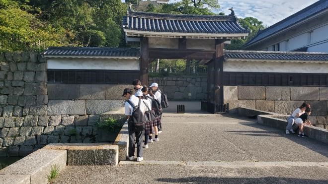 まち歩きの新たな発見から興味・関心を広げて探究活動に活かすために「丸亀まちさんぽ」を行いました。はじめに、マルタスの案内人の方とミーティングをして、まち歩きを開始しました。部員の希望もあり、丸亀城を散歩することになりました。市民広場の横を通ってお城に向かっていきましたが、広場の中に様々な石碑やモニュメントがあり、見つける度に、足をとめて見ていきました。いつもは気にも留めていなかったものに触れる時間もいいものだなと感じました。その後、丸亀城をぐるっと一回り歩きました。お城の石垣の復旧工事の現場など、日ごろまじまじと見ることがない風景をゆったりと時間をかけて見ることができました。最後に、老舗和菓子屋さんの「寶月堂」に向かいました。文化庁指定の有形文化財に指定されている施設を、会長のおかみさんに案内してもらい、部員にとっても歴史に触れる良い学びとなりました。こうした校外活動を次の探究学習につなげていきたいです。