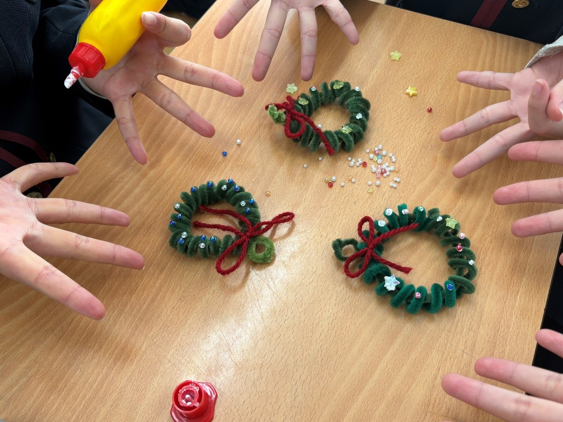 毛糸やビーズなどの材料を工夫して組み合わせ、それぞれの個性が光る作品を完成させました。色合いやデザインにもこだわり、世界に一つだけのツリーやリースが教室を彩りました。