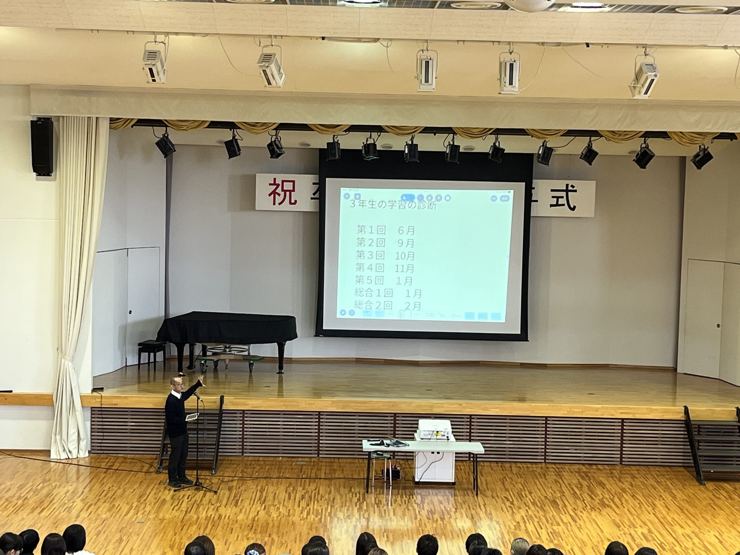 3月7日(土)、2年生を対象にした進路説明会と修学旅行説明会を行いました。進路説明会では、2年生の学習の診断や過去の資料を用いて、これからの進路や高校入試までの流れなどについての説明がありました。修学旅行説明会では、修学旅行に向けての心構えと行程などについての話がありました。生徒たちは、沖縄に向かうということで文化体験や自然体験学習を楽しみにしているようでした。この説明会を経て、来年度は最上級生となる意識が高まったように思います。