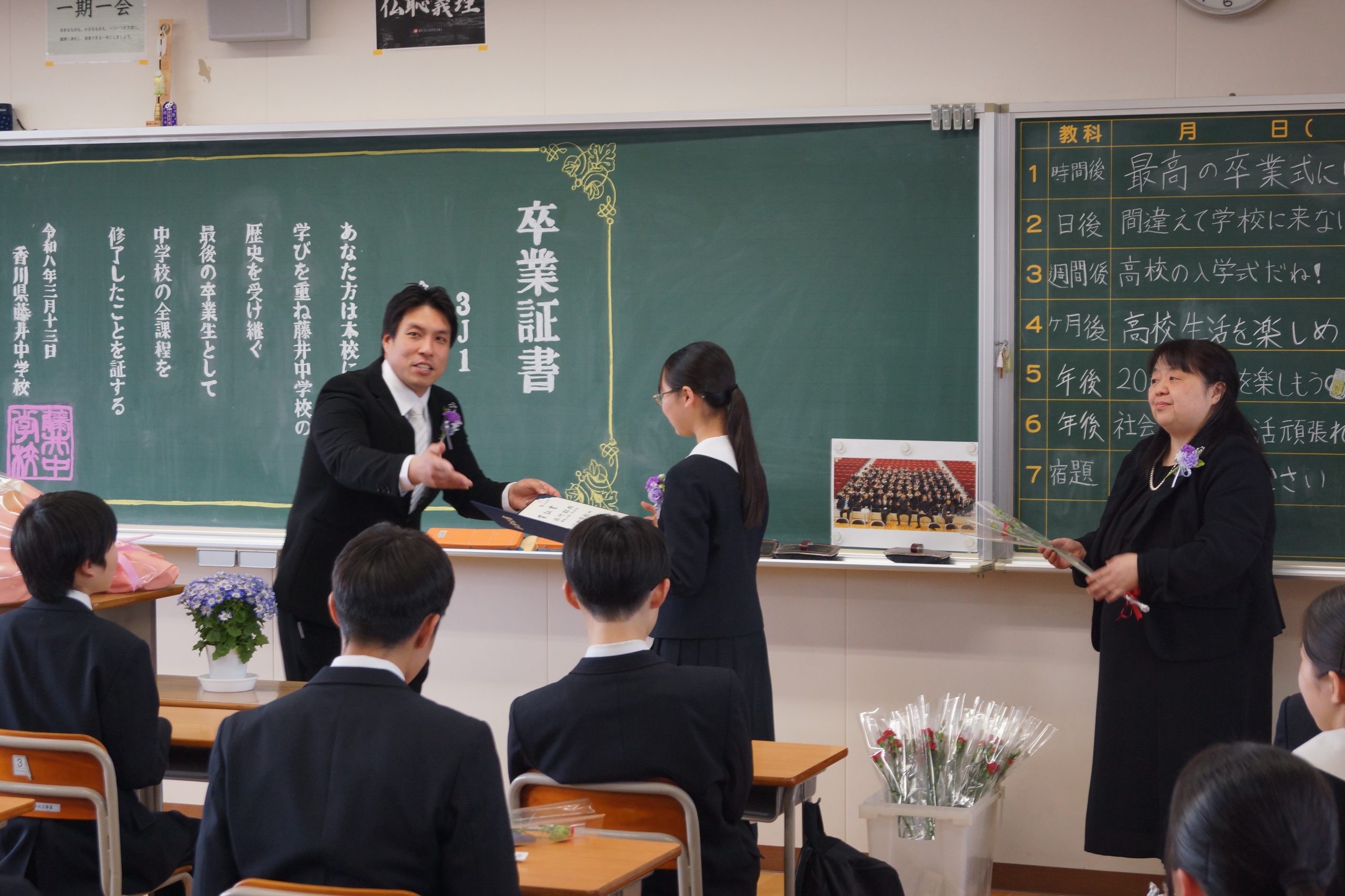 いよいよ退場の時。会場には、藤中フェスタの合唱で3年生が心を込めて歌った「正解」が流れました。そのメロディーに乗せて、各クラスの代表が会場全体へ向けて感謝のメッセージを伝え、一歩ずつ会場を後にしました。自分たちの軌跡を象徴する歌と、仲間や恩師へ向けた最後の言葉に、会場は大きな拍手と感動に包まれました。