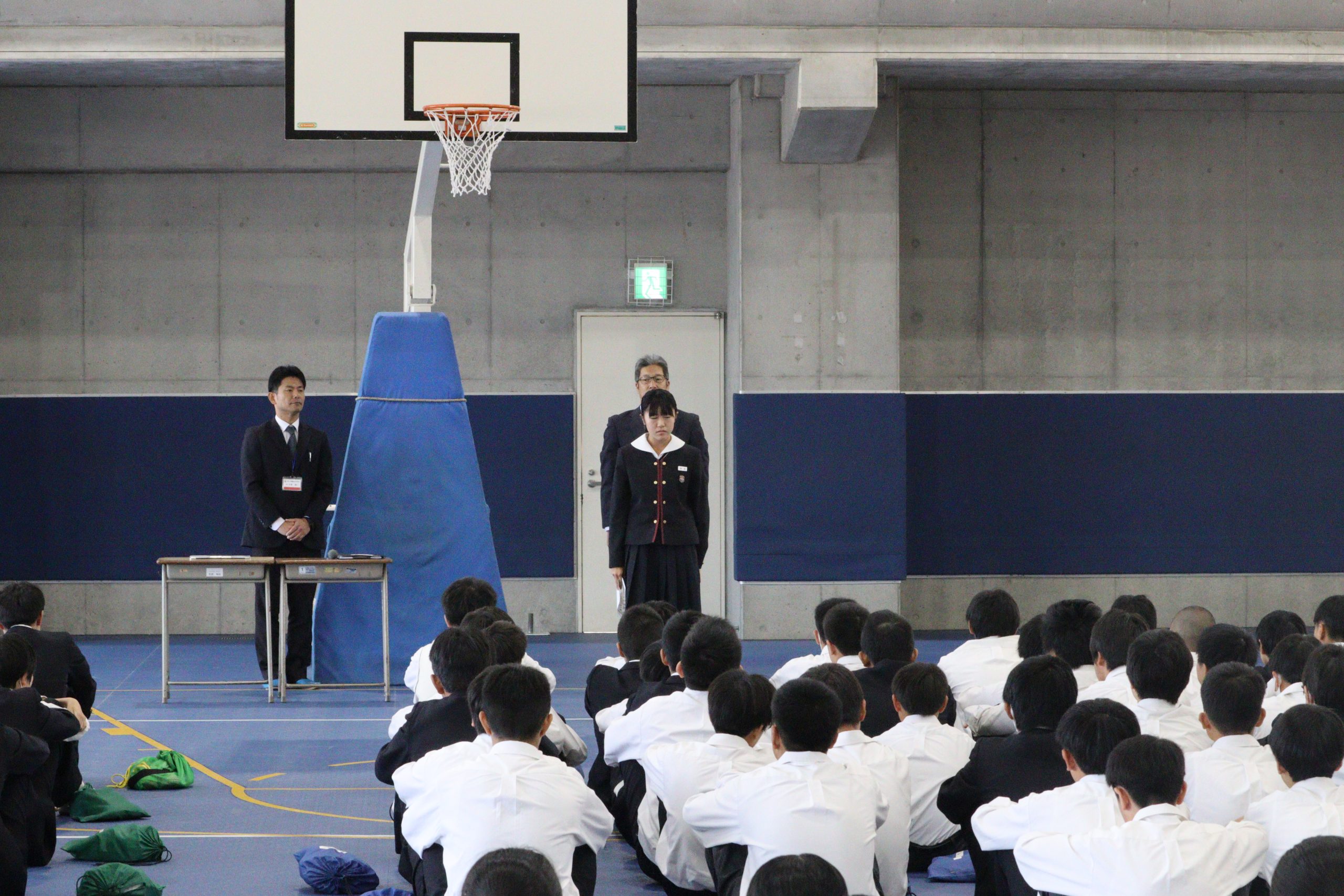 生徒たちは静かに整列し、真剣な表情で話に耳を傾けていました。