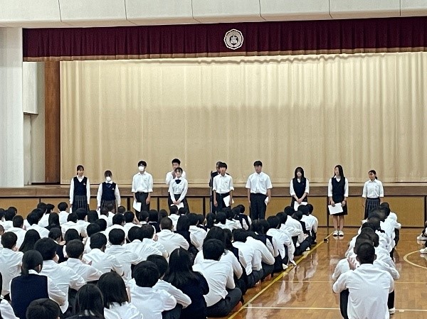 開会宣言に続き、新役員が任命され、新旧役員が交代しました。旧生徒会長の挨拶の後、校長から新役員に任命書が手渡されると、新会長が抱負の言葉を述べました。