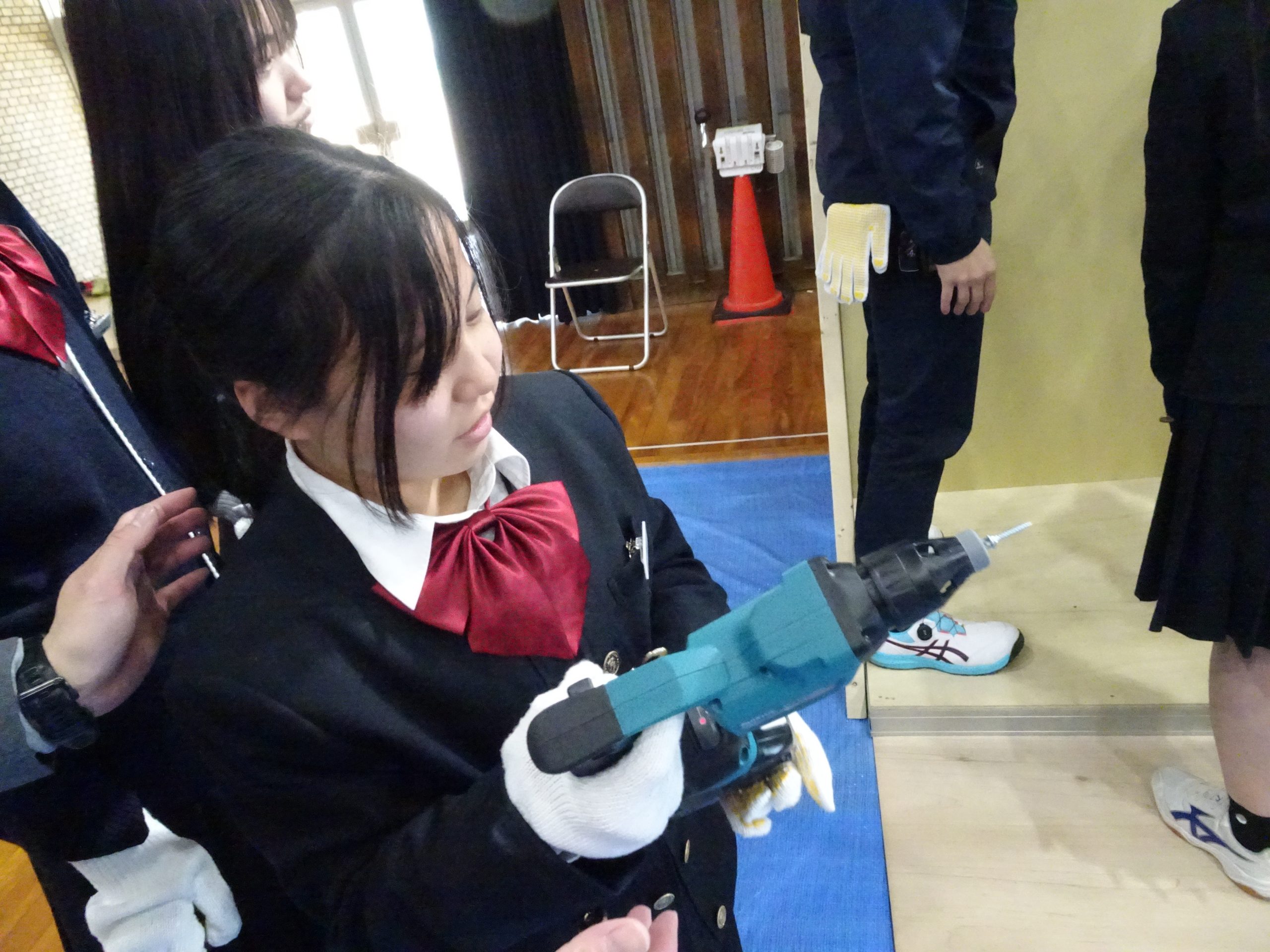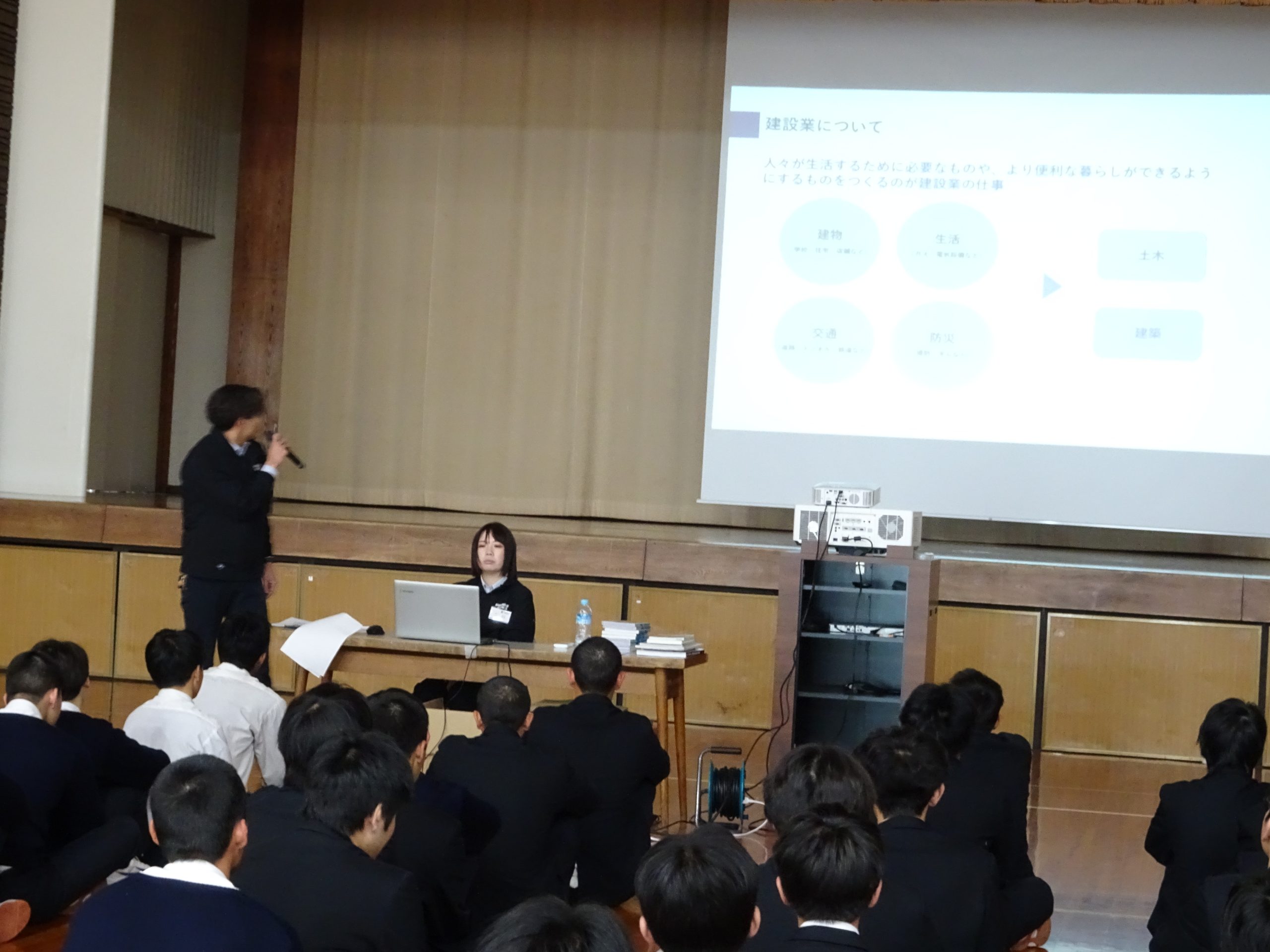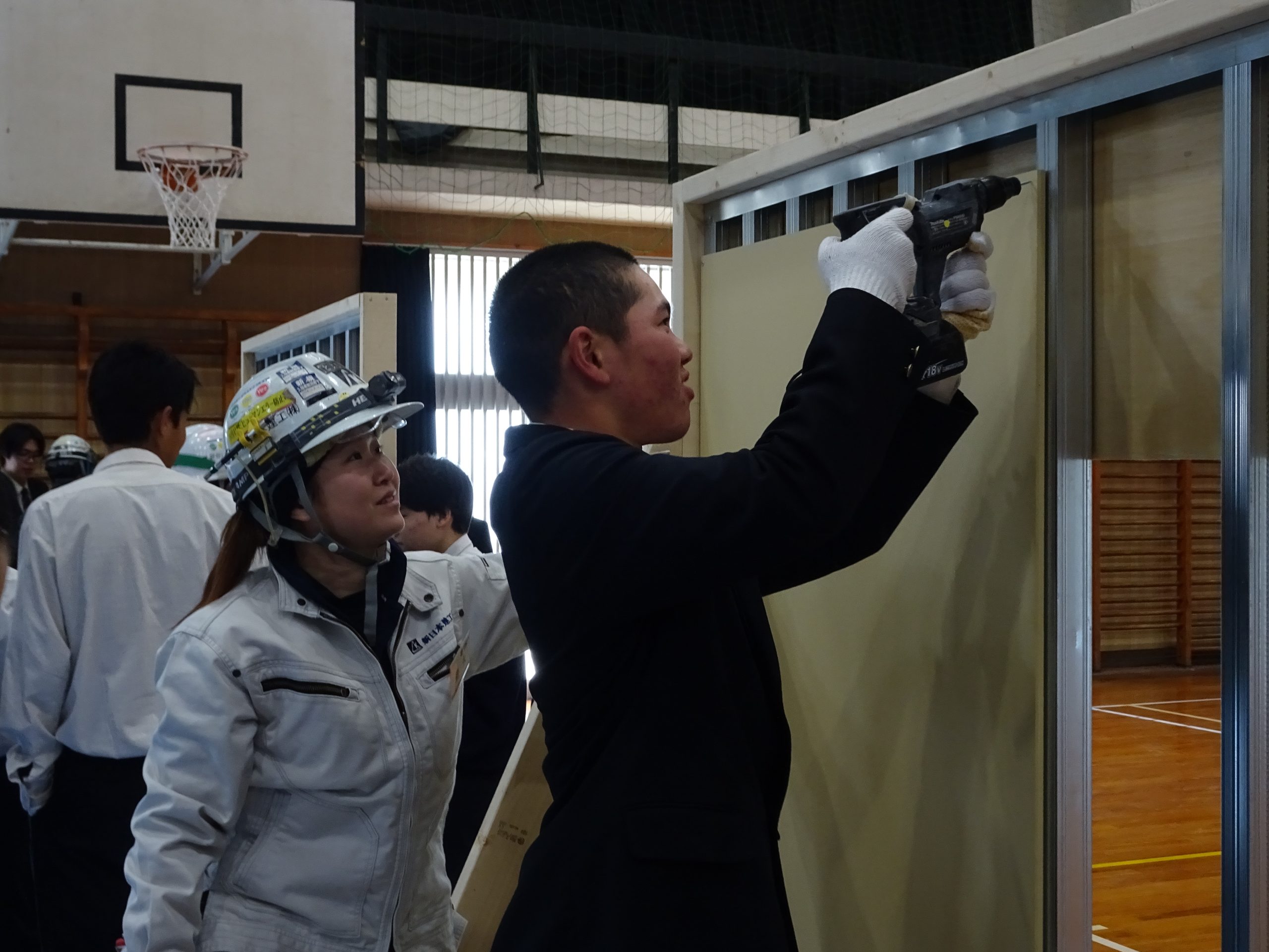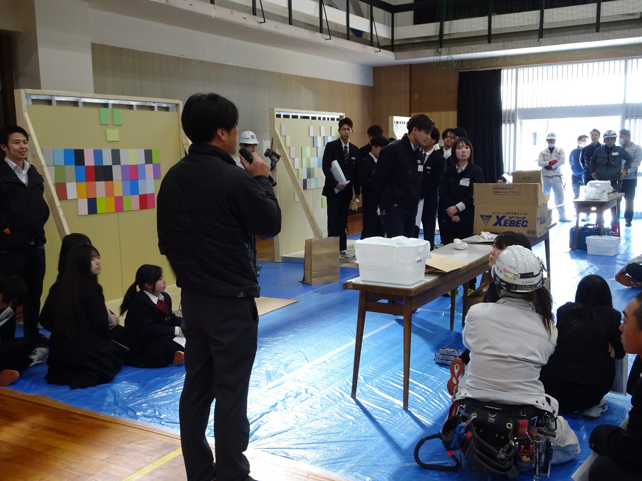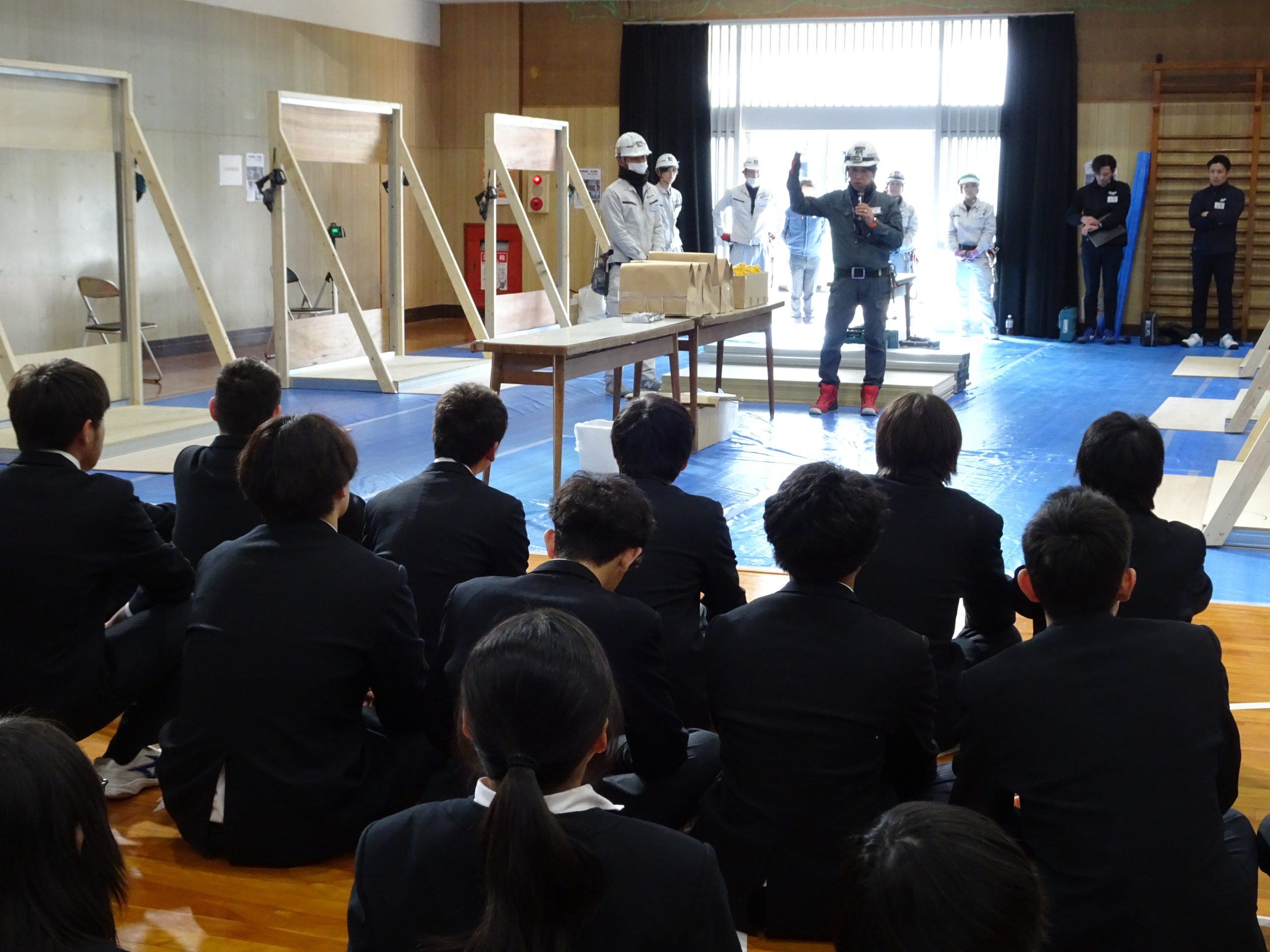 体育館に集合し、まずは内装業や金属工事について、業務内容を交えながら詳しく学びました。普段なかなか触れることのない分野ということもあり、生徒たちは興味津々。説明を聞く姿もとても真剣でした。