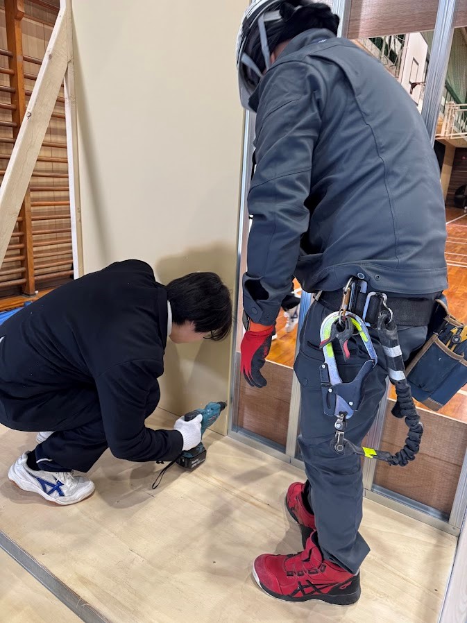 その後は、いよいよ内装業のお仕事体験へ。実際に使用されている資材で作られた模装建物に、軽量鉄骨を組み込み、ボードを貼り付ける作業に挑戦しました。初めて扱う工具に少し緊張しながらも、協力し合いながらしっかり取り付けることができました。